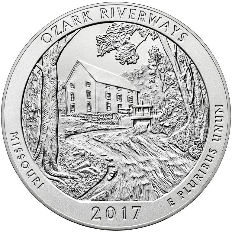 This ATB entry is the 38th in the series and likewise has a mintage of 20,000. The third ATB coin made in 2017 depicts the Ozarks wilderness in all its untamed and sometimes unwelcoming beauty. Both of the coins come from Philadelphia and sport William Cousins' design. Perhaps Philadelphia's mint was experiencing some press issues right around the time it was minting the two?
