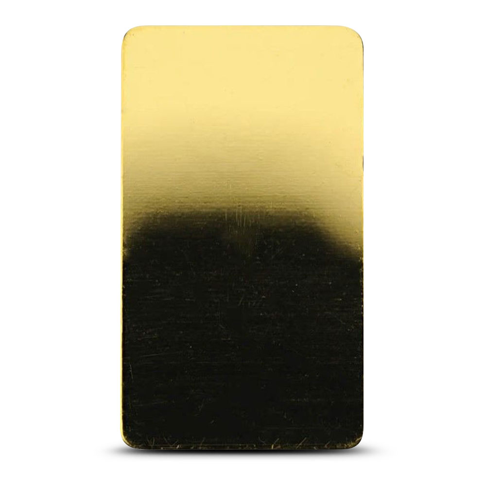 The obverse of 1/100 oz Scottsdale Horse Gold Bars shows a powerful horse running straight toward the viewer. Horse-year artwork often shows galloping horses with flowing manes, sometimes mid-leap, to capture energy and life. The weight, purity, and metal content are also included on this side. The reverse of the bar is blank.