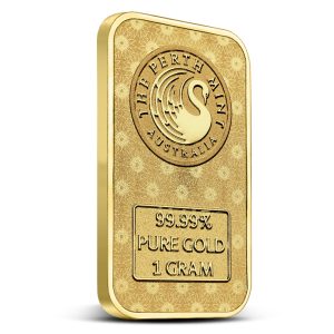 On the obverse side, the 1 Gram Perth Mint Lakshmi Gold Bar shows the Perth Mint logo. This emblem features a graceful swan set within a circular seal naming the mint and issuing nation. Lotus flowers form the background, and the bar’s identifying details are also shown here.