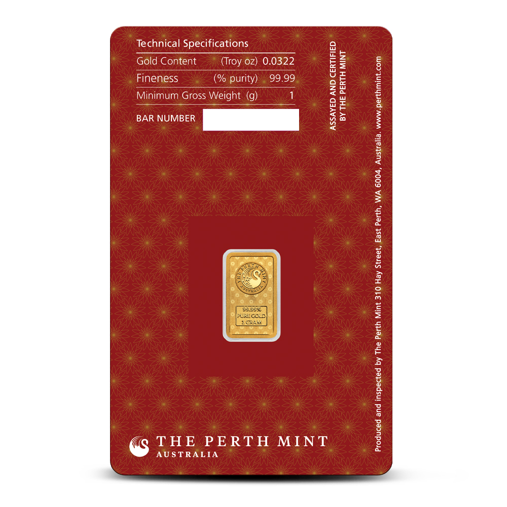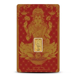 Each 1 Gram Perth Mint Lakshmi Gold Bar is individually packaged by the Perth Mint. The bars come in red assay cards that are sealed and tamper-evident, with Lakshmi’s image displayed on the card itself. For security, the bars include tiny micro-laser-engraved letters visible only under magnification.