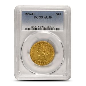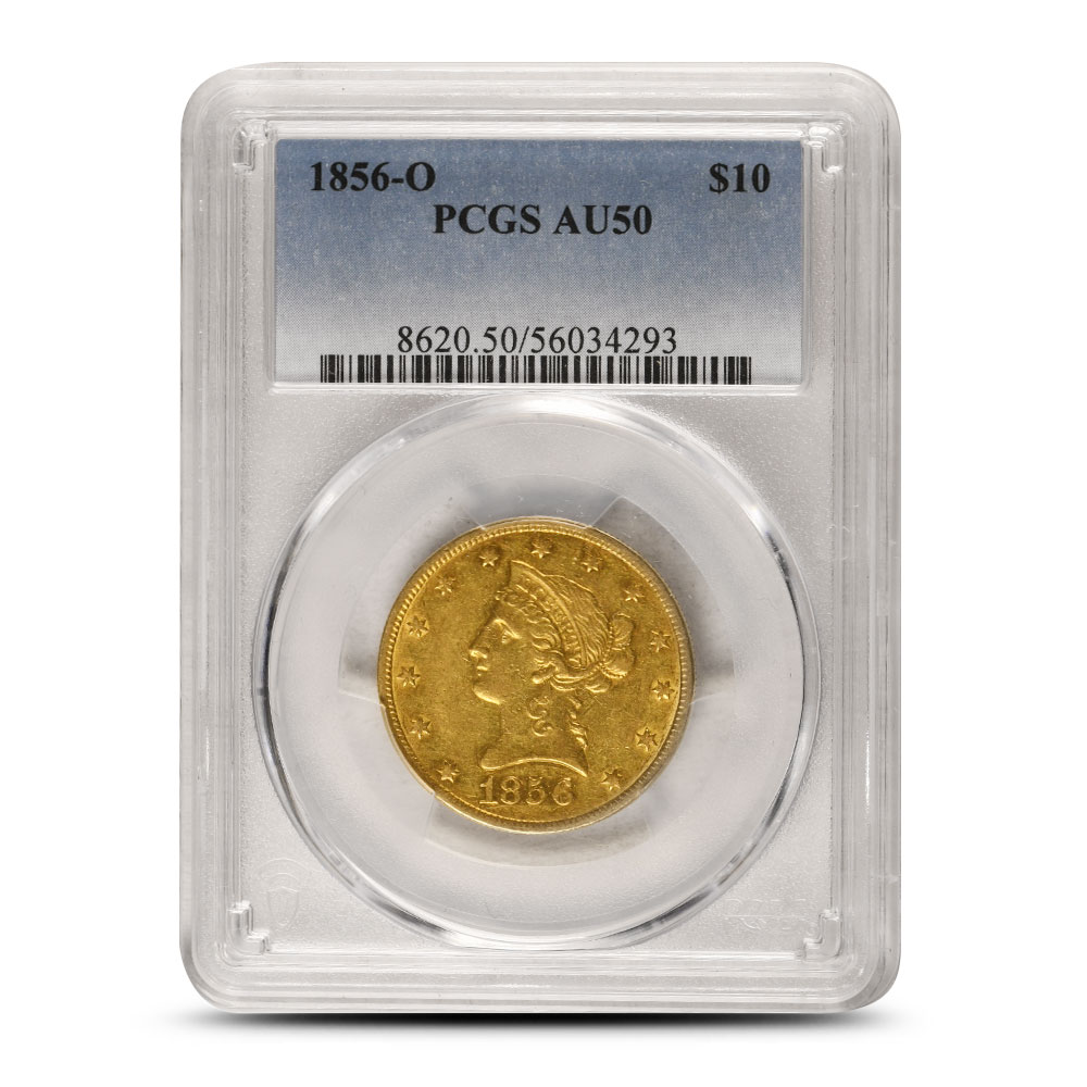 Each 1856-O $10 Liberty Gold Eagle in this listing ships in a plastic slab and is graded About Uncirculated 50. This grade indicates the coin has slight wear on the raised design areas and retains a good portion of its original luster. The low mintage and Southern origin make it a notable piece in the Liberty Eagle series and a tougher date to find.