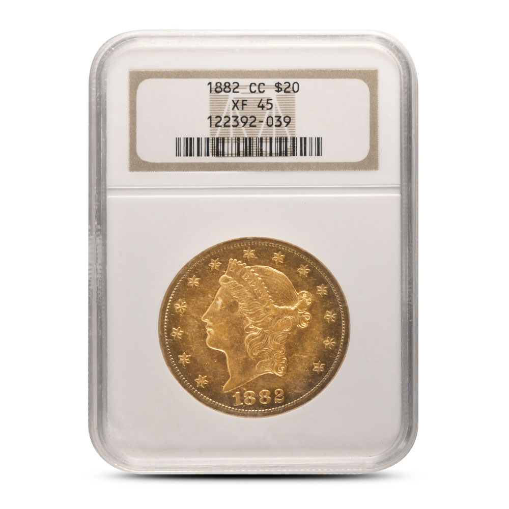 These 1882-CC $20 Liberty Gold Double Eagle Coins are available here in Extremely Fine 45 (XF45) condition. That means there’s light wear on the coin’s highest areas, but some original mint luster may still be visible.