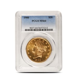 All 1900 $20 Liberty Gold Double Eagle Coins available here arrive in PCGS slabs and carry an MS64 grade. In this grade, you can expect pleasing overall eye appeal, typical mint luster, light, scattered contact marks, and a few faint hairlines.