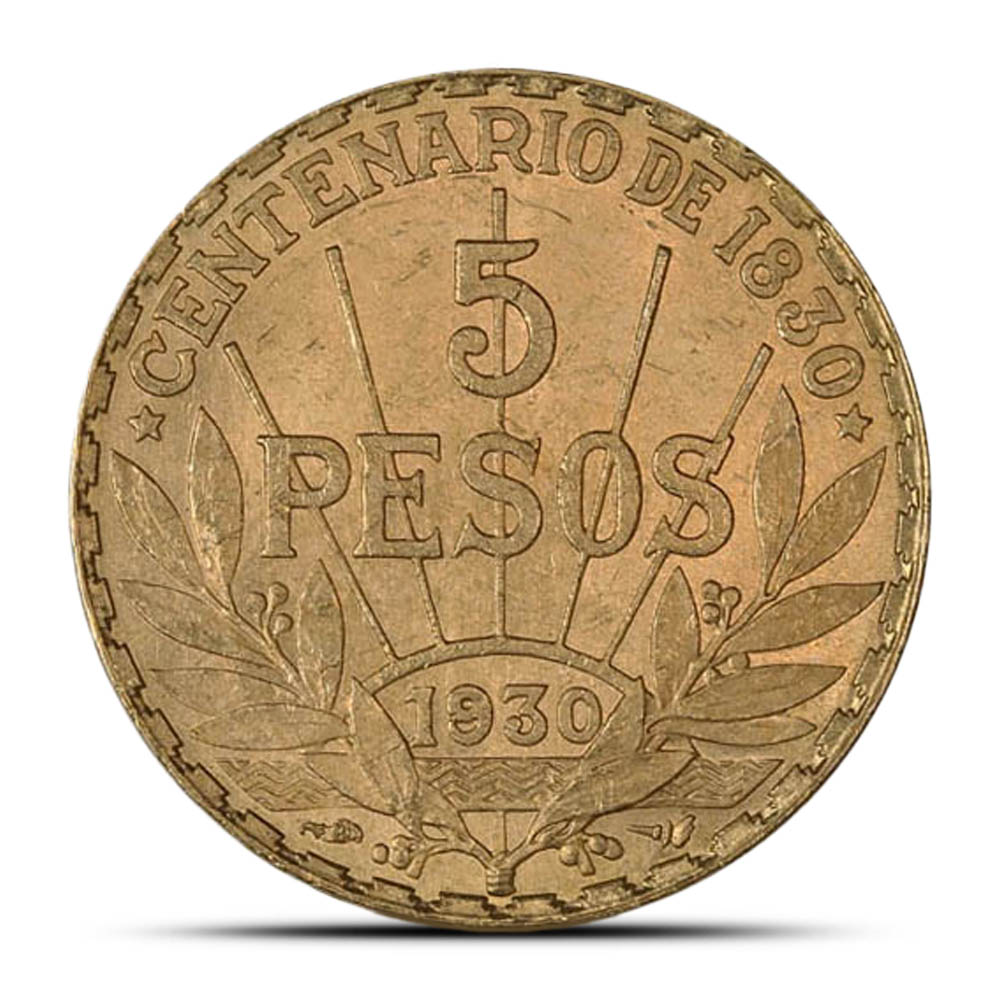The 5 Peso Uruguay Gold Coins were produced for Uruguay by the French Mint in Paris in 1930 to commemorate the 100th anniversary of the nation’s constitution, which was modeled after the US Constitution. An initial 14,415 coins were released in 1930, with another 80,000 reportedly entering the market in the 1990s through the Argentine central bank.
