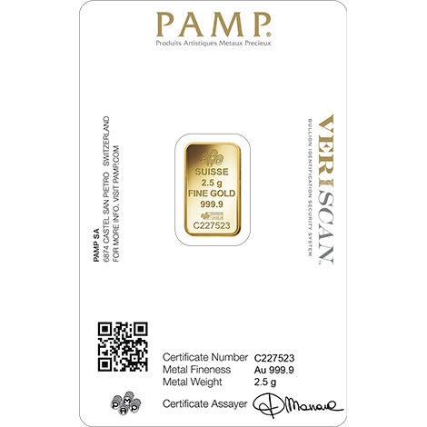 PAMP Suisse created Veriscan to make verification simple and reliable. With counterfeit items in the market, this system lets you confirm your 2.5 Gram PAMP Suisse bar by scanning the QR code on the packaging. The surface of each bar carries a unique microscopic “fingerprint,” captured at production. Later, you can scan your bar to match it to the stored record and confirm authenticity.