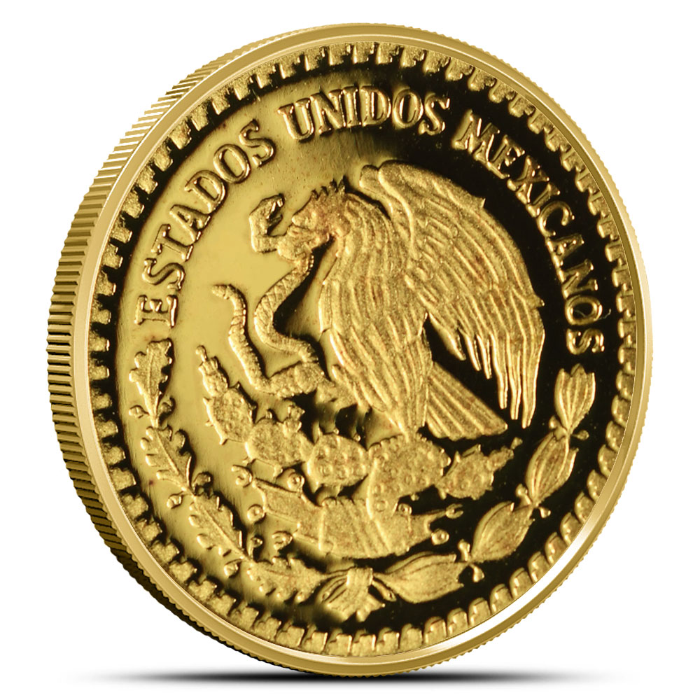 On the obverse side of 2009 Proof Mexican Gold Libertads, you will find the Mexican coat of arms. This image shows a golden eagle in left-profile clutching a snake while perched on a prickly pear cactus, an important symbol of Mexican heritage.