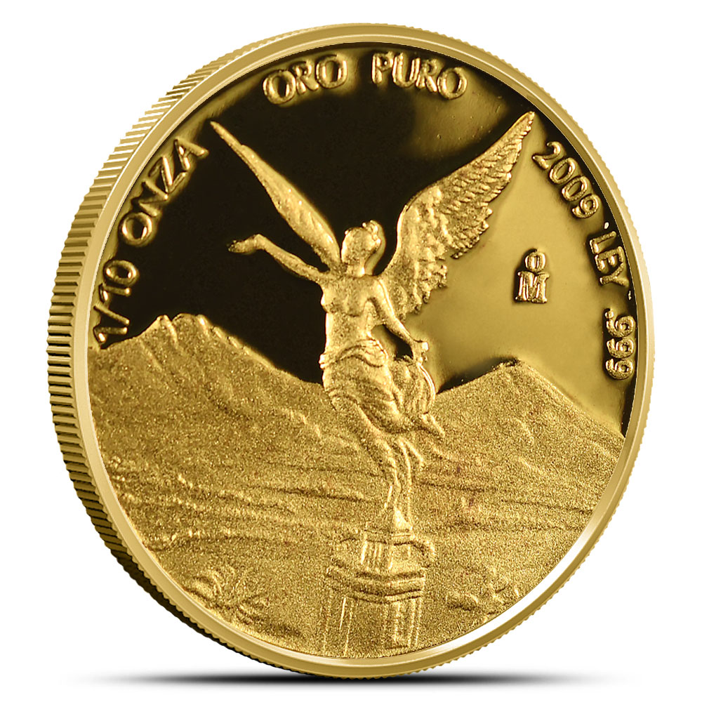 Proof Mexican Gold Libertads come from the Mexican Mint and are based on a historic coin first issued in 1921. Since 2004, the Proof Gold Libertad has been made available in five different weights. One of the smaller fractional-ounce coins is the 1/10 oz Gold Libertad, which is offered in both Proof and BU versions. Right now, BullionMax offers the 2009 1/10 oz Proof Mexican Gold Libertad Coins.