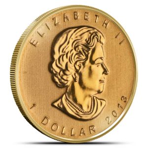On the obverse of the 2013 Canadian Gold Maple Leaf, you’ll see Queen Elizabeth II. This right-profile portrait was created by Susanna Blunt and is the longest-running design of Her Majesty on Canadian coins. Notably, she is shown without a crown in this depiction, a design used for nearly two decades.