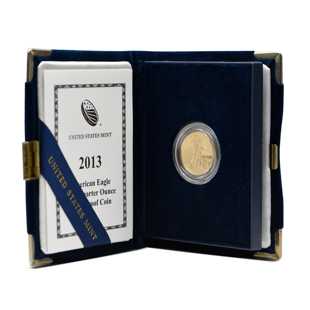 Proof American Gold Eagles are an important part of the United States Mint’s gold coin offerings. First released in 1986, the Gold Eagle Series originally included four BU coins and one proof coin. While all four weights were offered as BU coins from the start, the proof versions only began appearing in fractional sizes in 1987 and 1988. Today, BullionMax offers the 2013-W 1/4 oz Proof American Gold Eagle Coin for purchase.
