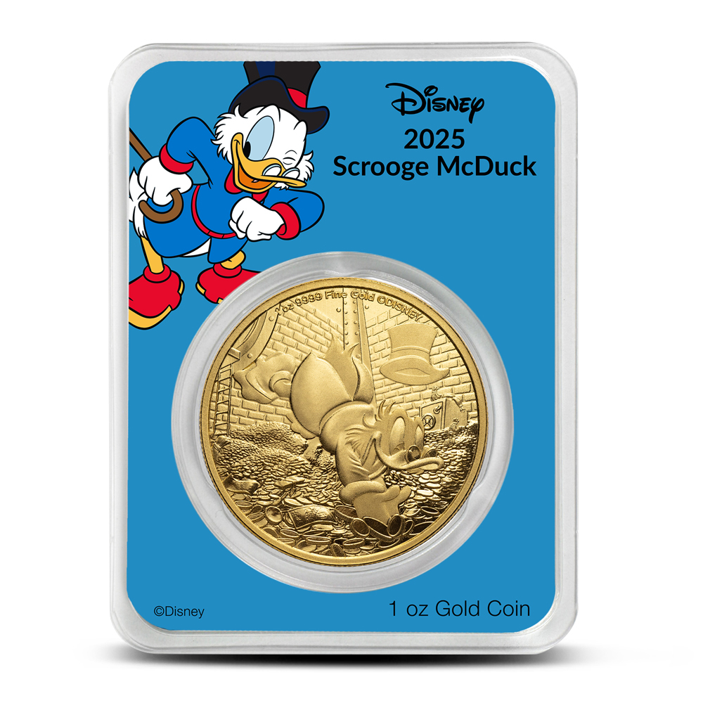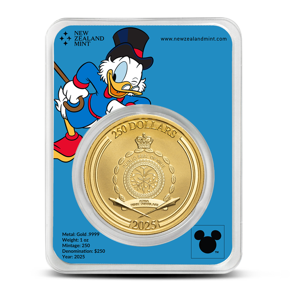 Scrooge McDuck first appeared in 1947, created by Disney artist Carl Barks for the Donald Duck tale “Christmas on Bear Mountain.” Inspired by Dickens’ Ebenezer Scrooge, Barks reimagined him as Donald’s wealthy Scottish uncle with a bold, adventurous streak. Now, 2025 1 oz Niue Scrooge McDuck Gold Coins are available at BullionMax.