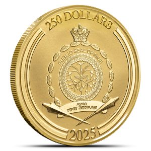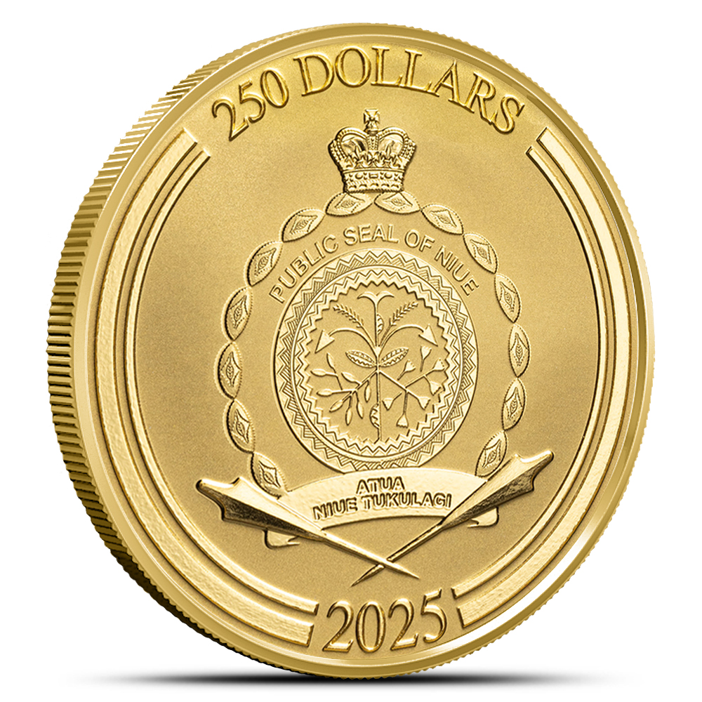 The obverse of the 2025 Niue Scrooge McDuck Gold Coin features the Public Seal of Niue. This official emblem includes native flora encircled by 14 seashells, with a Sovereign crown at the top to note Niue’s ties to the Commonwealth.