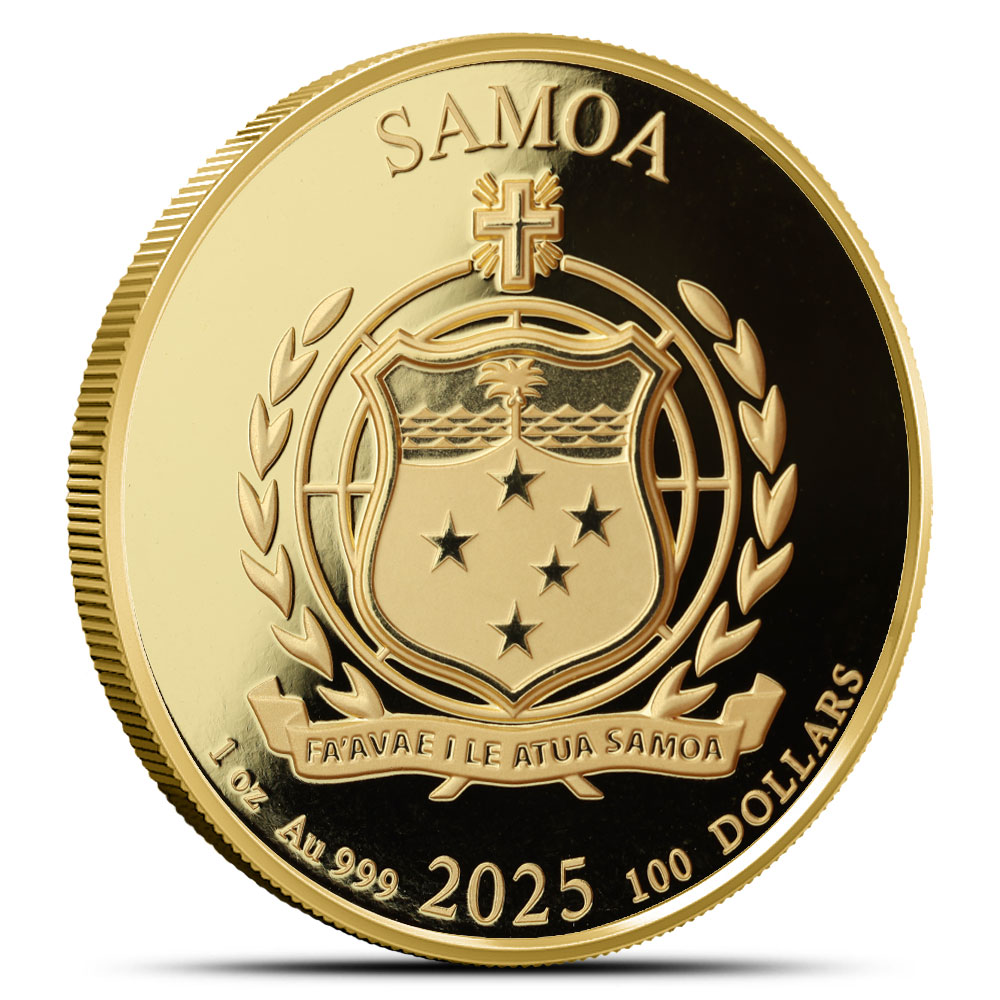 The obverse of this 2025 gold coin features Samoa’s national coat of arms. This design includes a central shield with a palm tree and ocean waves, along with the Southern Cross constellation below. A Christian cross is placed above the shield, while a ribbon beneath it reads “FA’AVAE I LE ATUA SAMOA,” meaning “God is the Foundation of Samoa.”