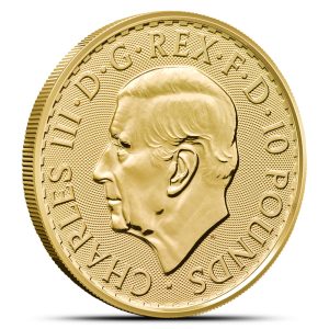 For the 2026 1/10 oz Gold Britannia Coins, the obverse features the portrait of King Charles III. This first official likeness of the King for British currency was introduced in 2022 by sculptor Martin Jennings. The design shows the monarch in left profile and without a crown.
