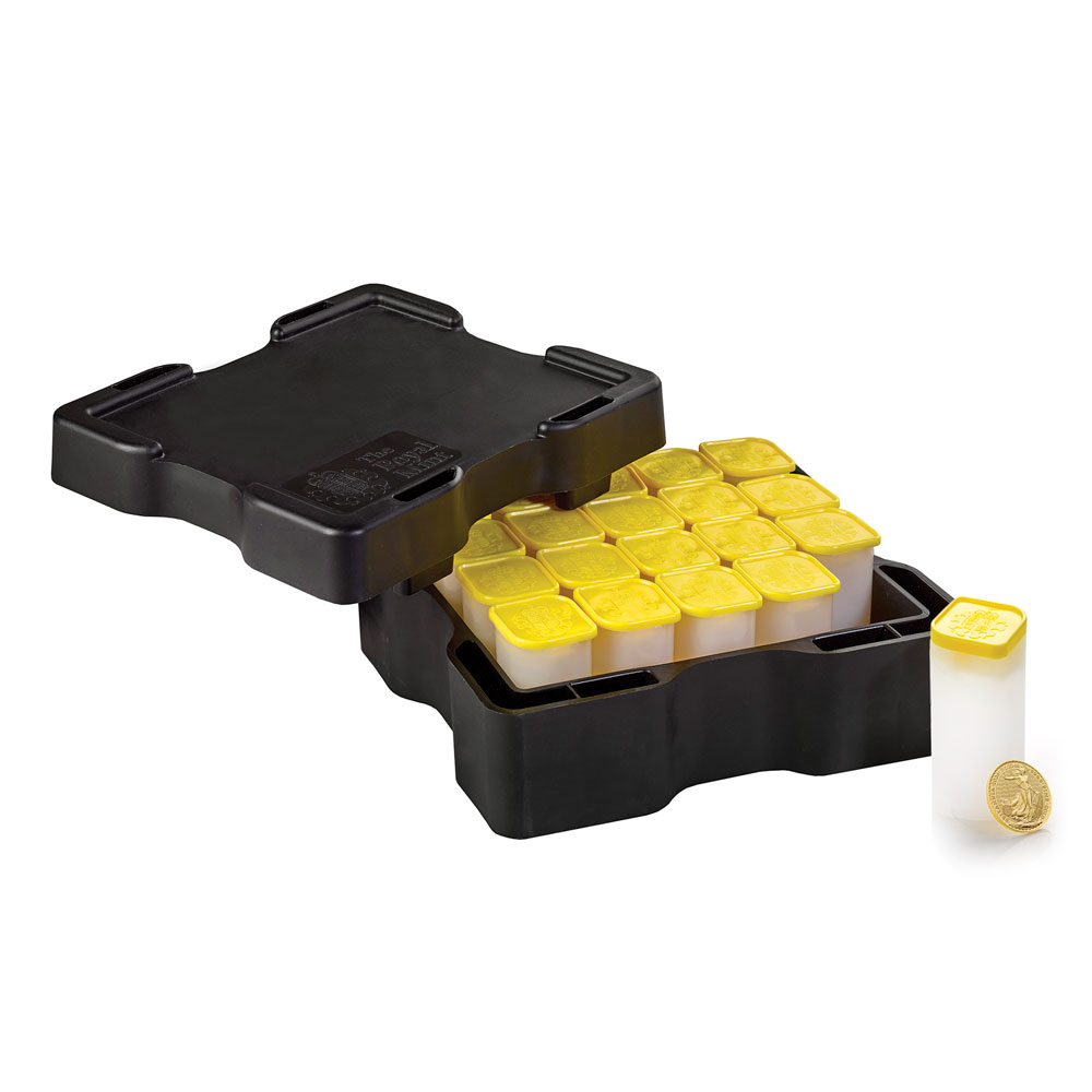 These 2026 1/10 oz British Gold Britannia Coins are offered individually in plastic flips or in acrylic tubes of 25 coins. Each coin comes in Brilliant Uncirculated condition. The enhanced security measures include motion-style surface waves in the background, traditional tincture lines, a latent security mark, and precise micro-text.