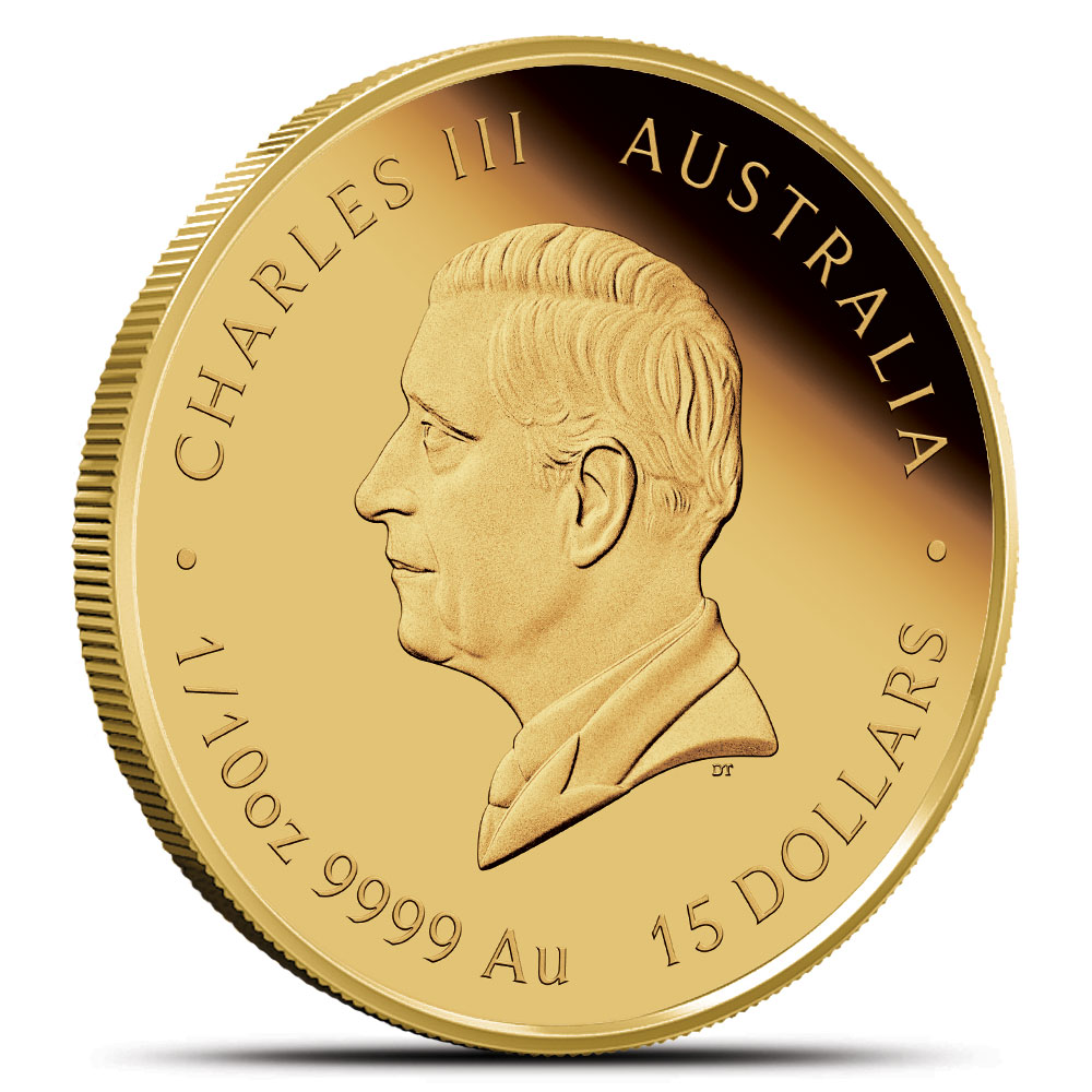 The obverse of the 2026 1/10 oz Proof Gold Lunar Horse features the first official effigy of King Charles III used on Australian coinage. Designed by Dan Thorne, the portrait appears in left-profile relief with a clean, modern presentation suited to current issues.