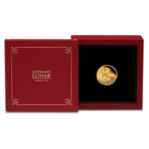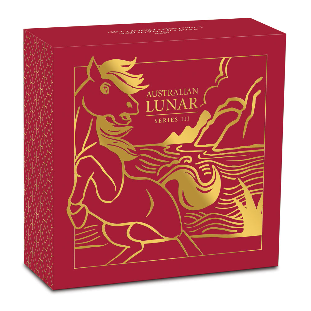 Each 2026 1/10 oz Proof Australian Gold Lunar Horse Coin comes in an individual capsule and is presented in a red Perth Mint display box. The outer shipper is themed for the Year of the Horse, and a Certificate of Authenticity is included. Perth Mint limits this presentation to 2,500 coins.