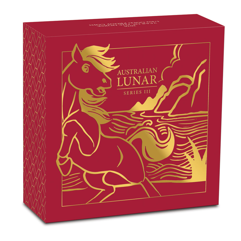 All 2026 1/4 oz Proof Australian Gold Lunar Horse Coins arrive in official Perth Mint packaging. You’ll receive the red display box, a Year of the Horse outer shipper, and a matching Certificate of Authenticity. Perth Mint limits this presentation to 3,500 coins.