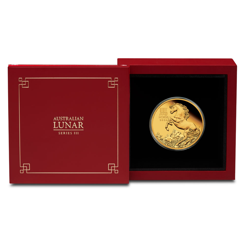 Each 2026 1 oz Proof Australian Gold Lunar Horse Coin comes packaged by the Perth Mint with a protective capsule, a red display box, and a Year of the Horse–themed outer shipper. A Certificate of Authenticity is included. The mintage for this proof release is capped at just 1,000 coins.