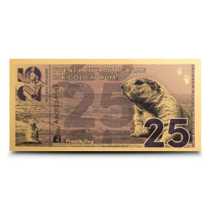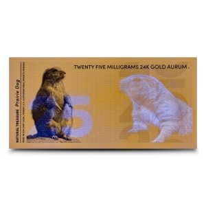 These 25 Milligram Prairie Dog Gold Notes are packaged in currency sleeves. This is the smallest denomination currently available in the Natural Treasures Series, joining other sizes that include 50 mg to 1000 mg notes. Dates will vary by note, and we are unable to guarantee a specific year.