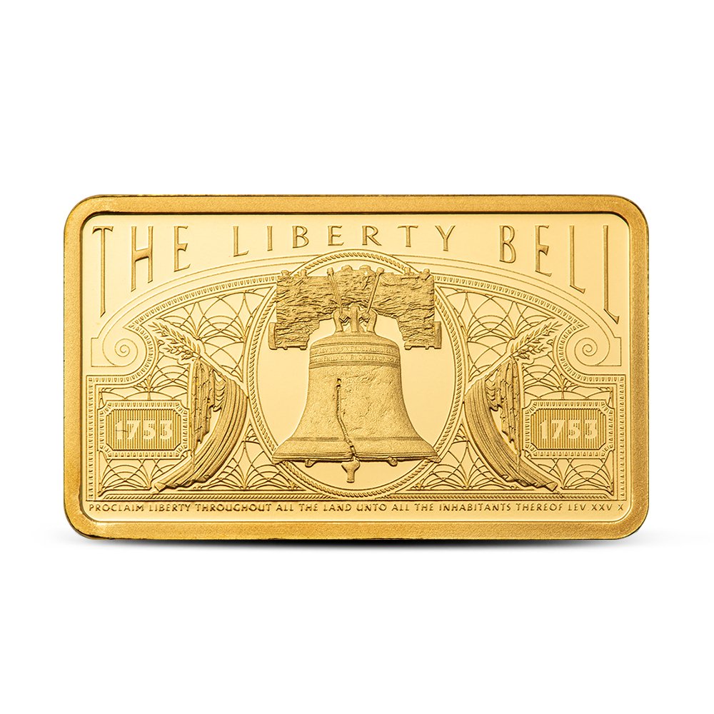 Each 5 Gram PAMP Suisse America the Free Liberty Bell Gold Bar comes in its own protective packaging. These bars are sealed in a CertiPAMP assay card that features an American flag motif. The proof-like finish includes frosted design elements against mirror-like fields.
