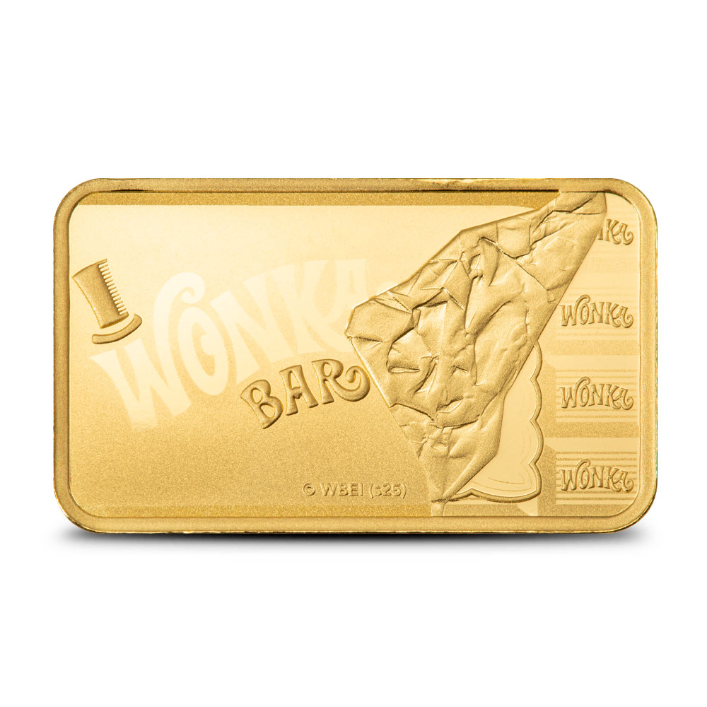 On the reverse of the 5 Gram Willy Wonka Chocolate Gold Bar, you’ll see another view of the opened Wonka Bar. This side also reveals the edge of the golden ticket, a reminder of the chance to enter the factory and how a single find can change the course of the story.