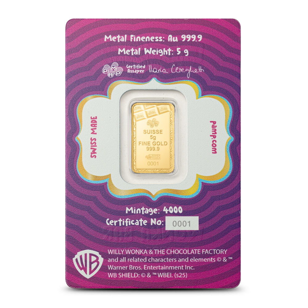 Each 5 Gram PAMP Suisse Willy Wonka Chocolate Gold Bar arrives sealed in a CertiPAMP assay card. The card and the matching gift sleeve carry Willy Wonka artwork and list the bar’s key details. Every bar includes an individual serial number and proof-like visuals.