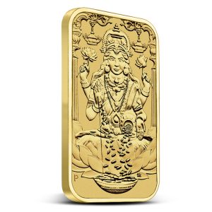 On the reverse of the 5 Gram Lakshmi Gold Bar, you’ll find a front-facing image of the goddess seated on a lotus. Traditional art often presents Lakshmi with four arms, symbolizing the four aims of life in Hindu philosophy: dharma (duty), artha (prosperity), kama (desire), and moksha (liberation). She is commonly shown with coins flowing from her hands to represent the wealth she grants, while the lotus stands for purity and spiritual growth.