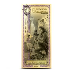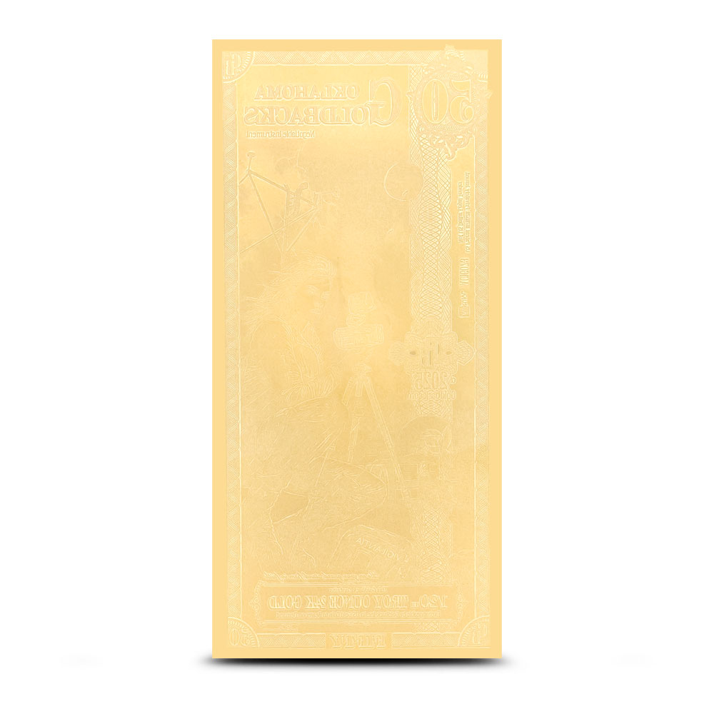 This 50 Oklahoma Goldback Gold Note is a fresh addition to the Goldback Series and comes sealed in a plastic sleeve. Like other notes in the series, it uses 24-karat gold to showcase photo-quality images that honor state history. The 50 Goldback note has been part of the lineup since the series began and was the highest denomination available until the release of a 100 Goldback note in 2025.