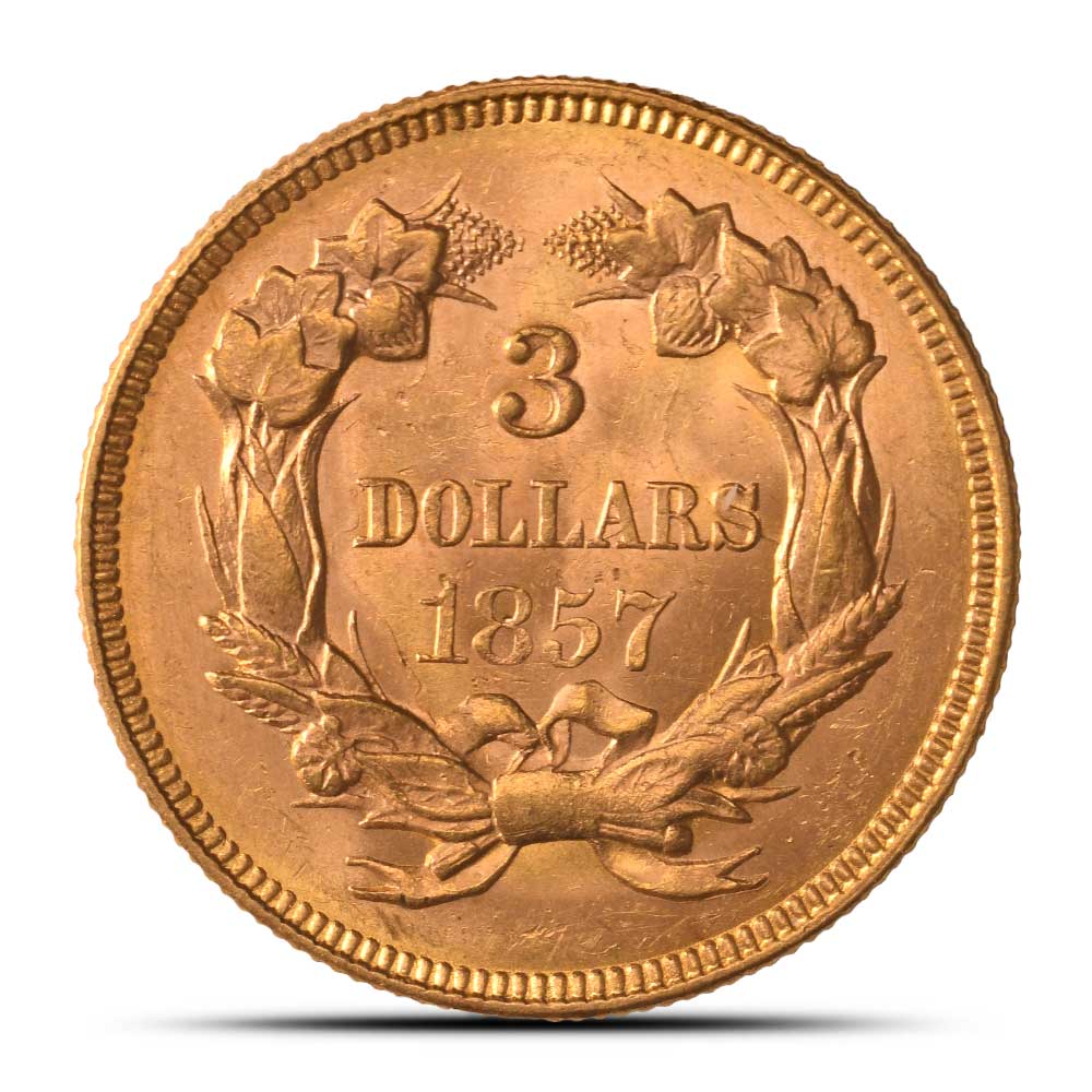 The reverse of the $3 Indian Princess shows a wreath around the denomination and date. Two styles were produced: Type I pieces display smaller letters for the word DOLLARS, while Type II pieces feature larger letters. Both types appear within this listing depending on current stock.