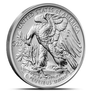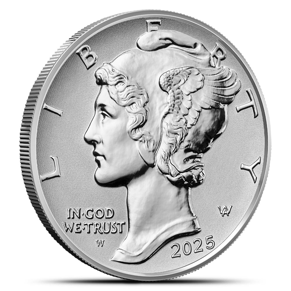 The obverse of the 2025-W Reverse Proof Palladium Eagle shows Adolph A. Weinman’s Winged Liberty design. Introduced in 1916, it depicts Liberty in profile wearing a winged cap, a symbol of freedom of thought. The design is often mistaken for Mercury, which is why the coin is sometimes called the Mercury Dime. Weinman’s artwork remains one of the most admired in US coinage.