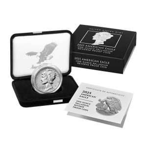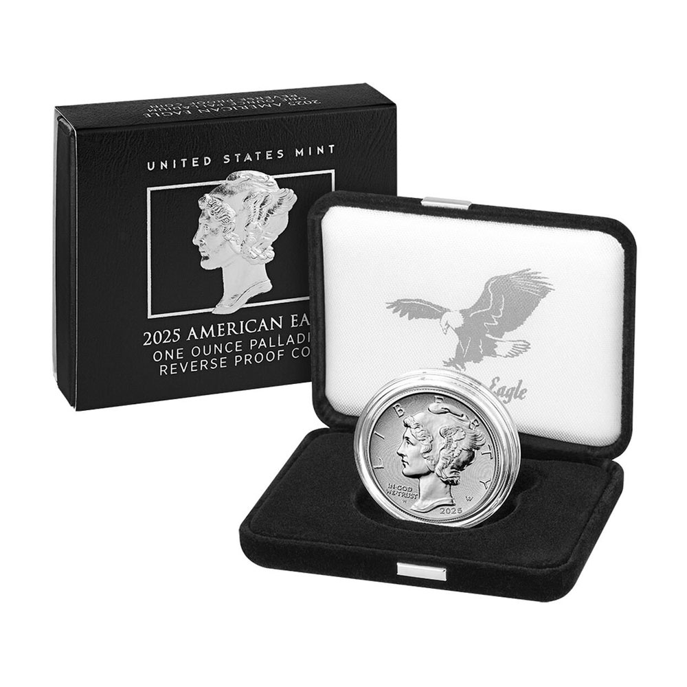 Each 2025-W 1 oz Reverse Proof American Palladium Eagle is sealed in a protective capsule and presented inside a blue US Mint box. The box includes a Palladium Eagle-themed outer shipper and comes with an official Certificate of Authenticity. This reverse-proof version features frosted backgrounds with polished design elements, giving the coin a unique contrast.