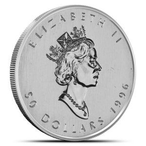The obverse of the 1996 Canadian Platinum Maple Leaf features a right-profile portrait of Queen Elizabeth II. She is shown wearing the George IV State Diadem and a simple necklace. This is the third-generation Canadian coin effigy of the Queen and the first portrait of her on Canadian coinage created by a Canadian artist, Dora de Pedery-Hunt.