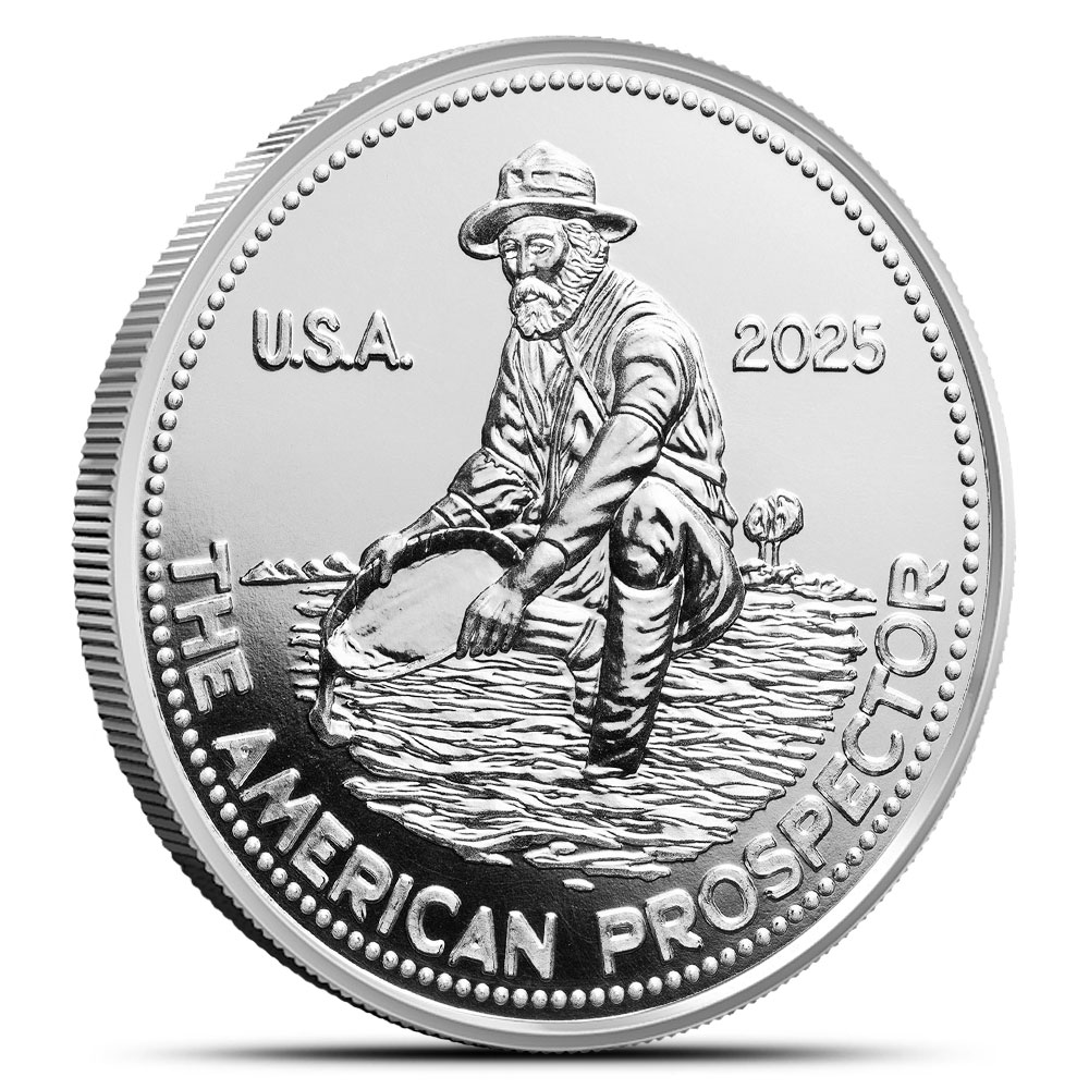 On the reverse of 1 oz Engelhard Prospector Silver Rounds, you’ll find the familiar American prospector scene. A miner is shown panning in a creek—an approach commonly used in the 19th century for finding gold and silver.
