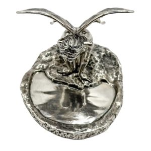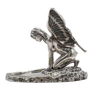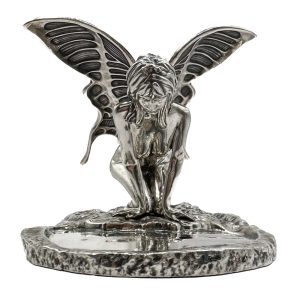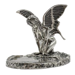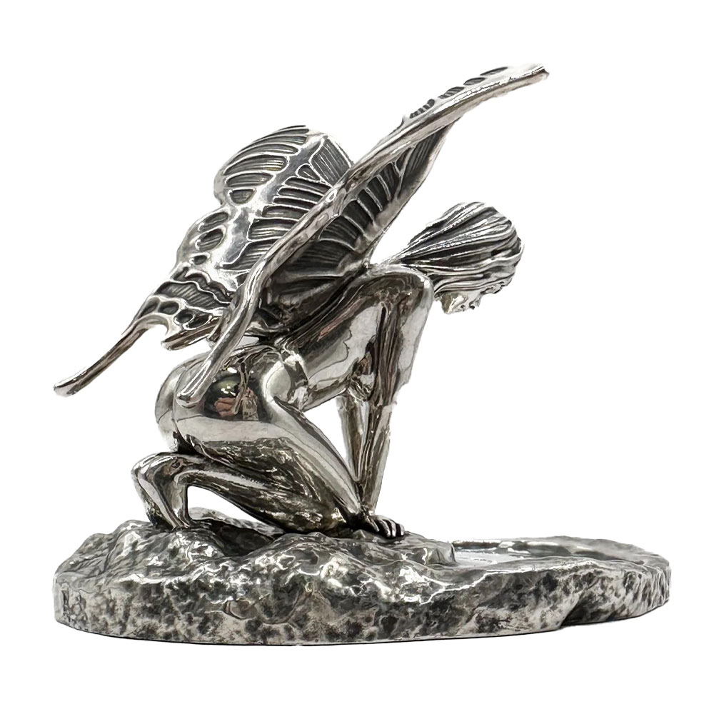The 12 oz Antique Finish Water Fairy Silver Statue shows a graceful figure kneeling beside a small pond. Her delicate wings and thoughtful pose give the piece a sense of quiet magic. Many tales describe water fairies as beautiful women closely tied to the lakes, rivers, or seas they protect, often with powers to control waves, call up storms, or offer blessings to those who respect their realms.