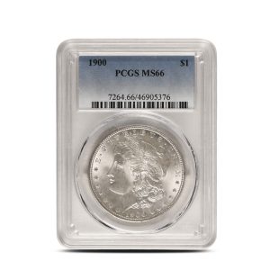 Each 1900 Morgan Silver Dollar available here comes in a protective slab and holds a Mint State 66 grade from PCGS. Coins in this grade have bright luster with only a few small marks. Some of these marks may be in key areas, and there might be faint hairlines, but none are visible without magnification.