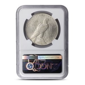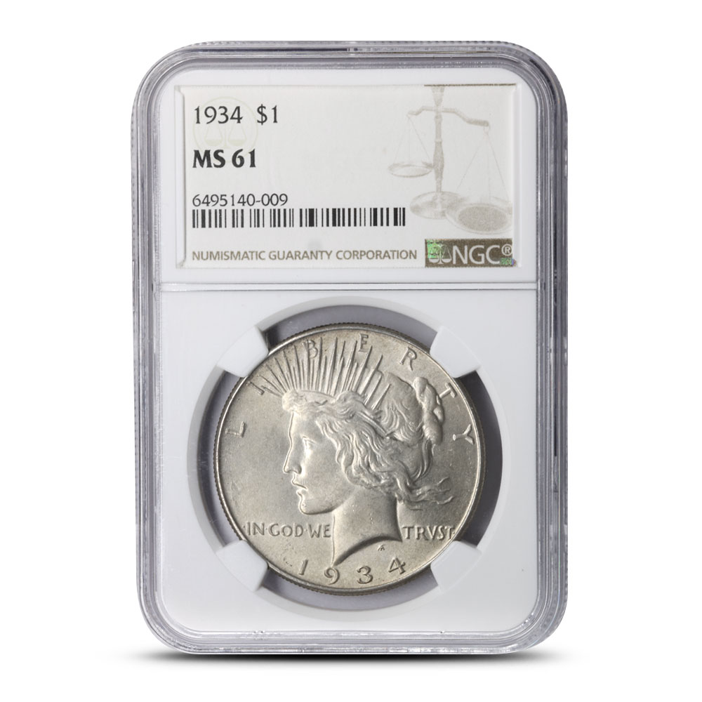 Each 1934 Peace Silver Dollar Coin available here is graded Mint State 61 and comes in a protective slab. Coins at this grade have some noticeable marks and may show hairlines and scuffs, but still maintain overall mint condition with original luster present, though impaired.