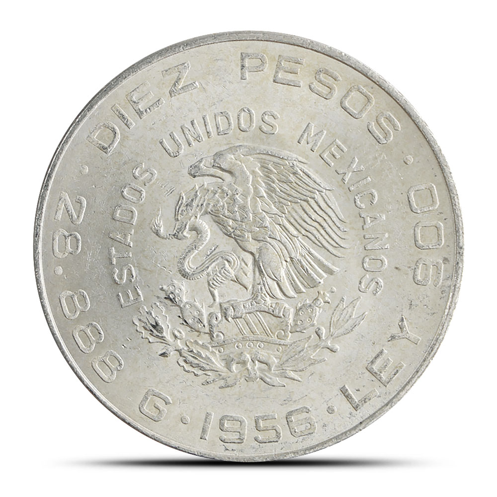 Each 1955-1956 10 Peso Mexican Silver Coin comes safely packaged in a protective flip. Struck with 90% silver and 10% copper, these coins represent a historic period of Mexican coinage. All coins in this series are offered at random once your payment clears, so we cannot guarantee whether you will receive a coin from 1955 or 1956, nor can we guarantee whether it will be AU or XF condition.