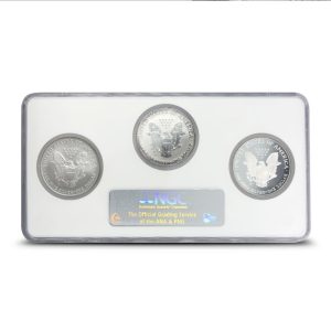 Each coin in these certified 2006-W Proof American Silver Eagle 20th Anniversary 3-Coin Sets comes sealed in a protective slab and graded Mint State or Proof 69 by the Numismatic Guaranty Corporation (NGC). Coins at this level show full original mint luster with only tiny flaws. Any marks are limited to faint contact lines or hairlines that do not appear in the main design areas.
