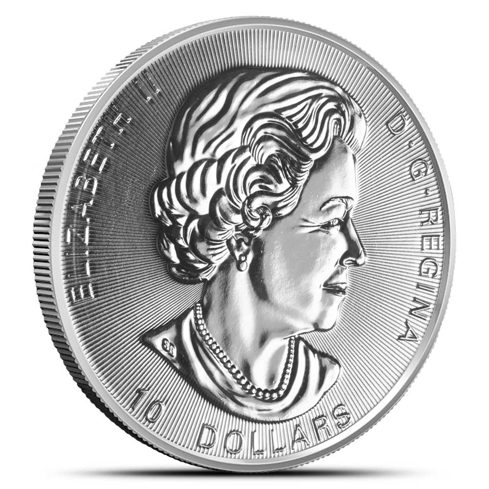 The reverse of the 2022 2 oz Silver Twin Maples features two natural maple leaves joined to a single stem. The maple leaf appeared on military badges in World War I and became closely linked with Canadian service members abroad. It took center stage on February 15, 1965, when Canada adopted the current national flag with its stylized 11-pointed red maple leaf.