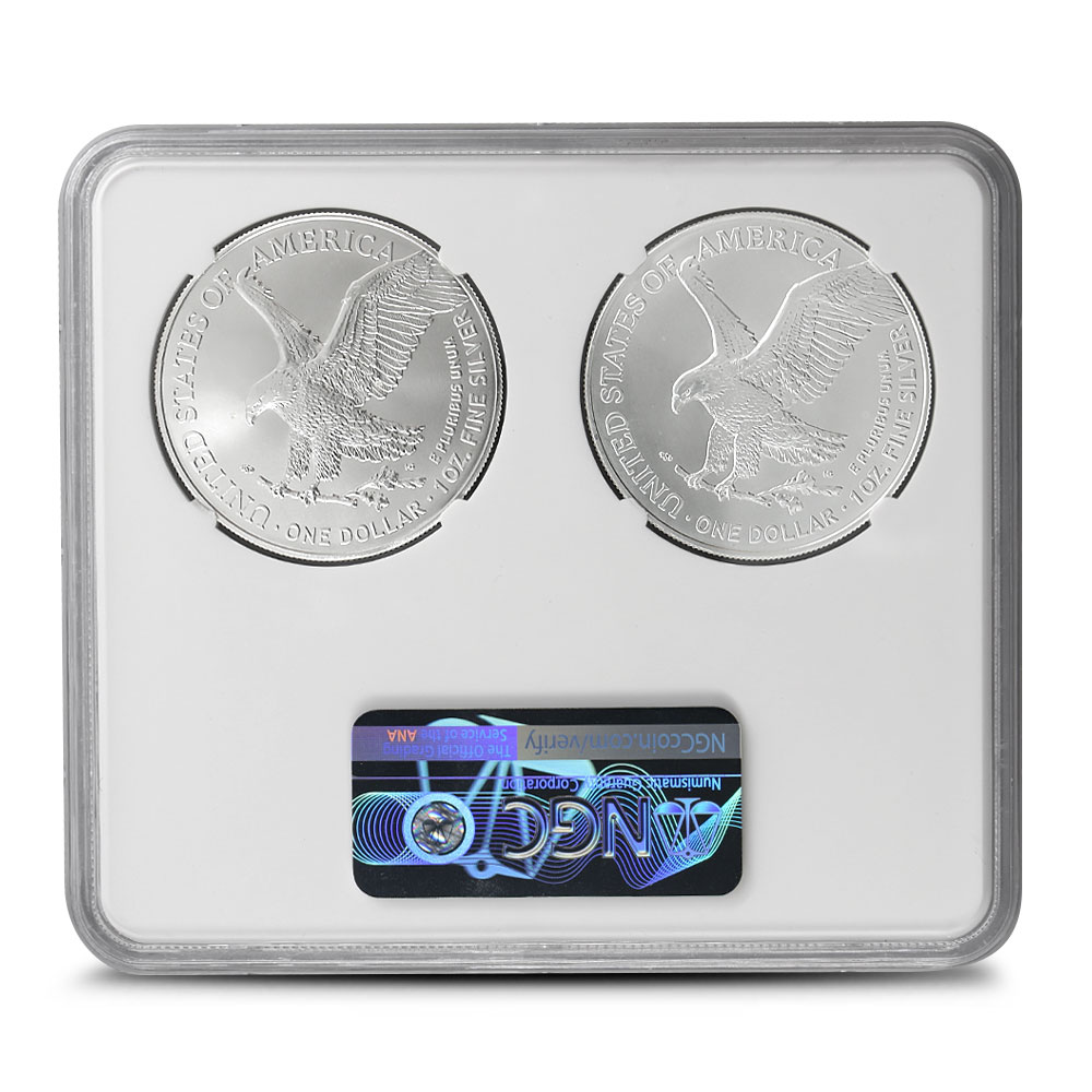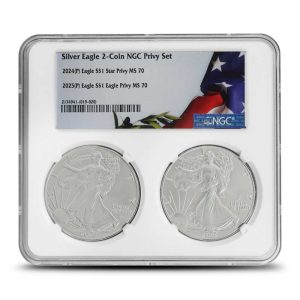Each 2024/2025 1 oz Star and Eagle Privy American Silver Eagle 2-Coin Set includes coins individually secured in plastic slabs. These coins are graded Mint State 70, meaning they show full original mint luster with no visible flaws under 5x magnification.