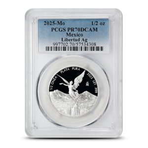 All 2025 1/2 oz Proof Mexican Silver Libertad Coins in this listing are certified in perfect condition and sealed in a protective slab. PR70 coins display full, original mint luster with no visible detractions on the fields or design details.