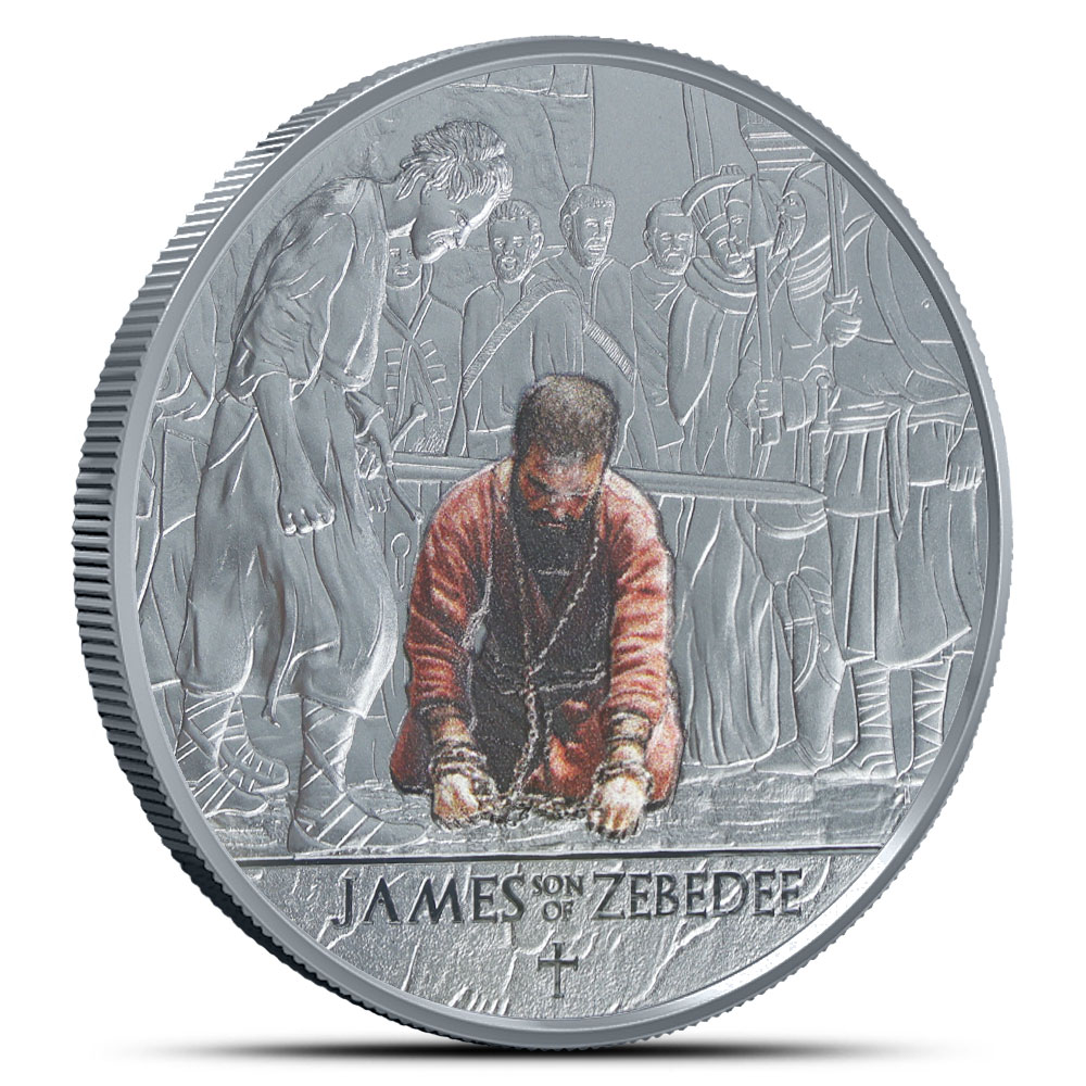 The Martyrdom of the Twelve Series pays tribute to the unwavering faith and sacrifice of the twelve apostles, the devoted followers of Jesus Christ. These men stood by Christ during his teachings and ultimately gave their lives for their beliefs. BullionMax now has the 2025 1 oz Black Proof Colorized Republic of Ghana Silver James the son of Zebedee Coins available for purchase.