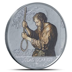 On the reverse, the coin presents a depiction of Judas Iscariot. He is shown in profile beneath a tree, holding a rope as he prepares to take his own life. This somber image represents Judas’ remorse after betraying Jesus, ultimately leading to his tragic end.