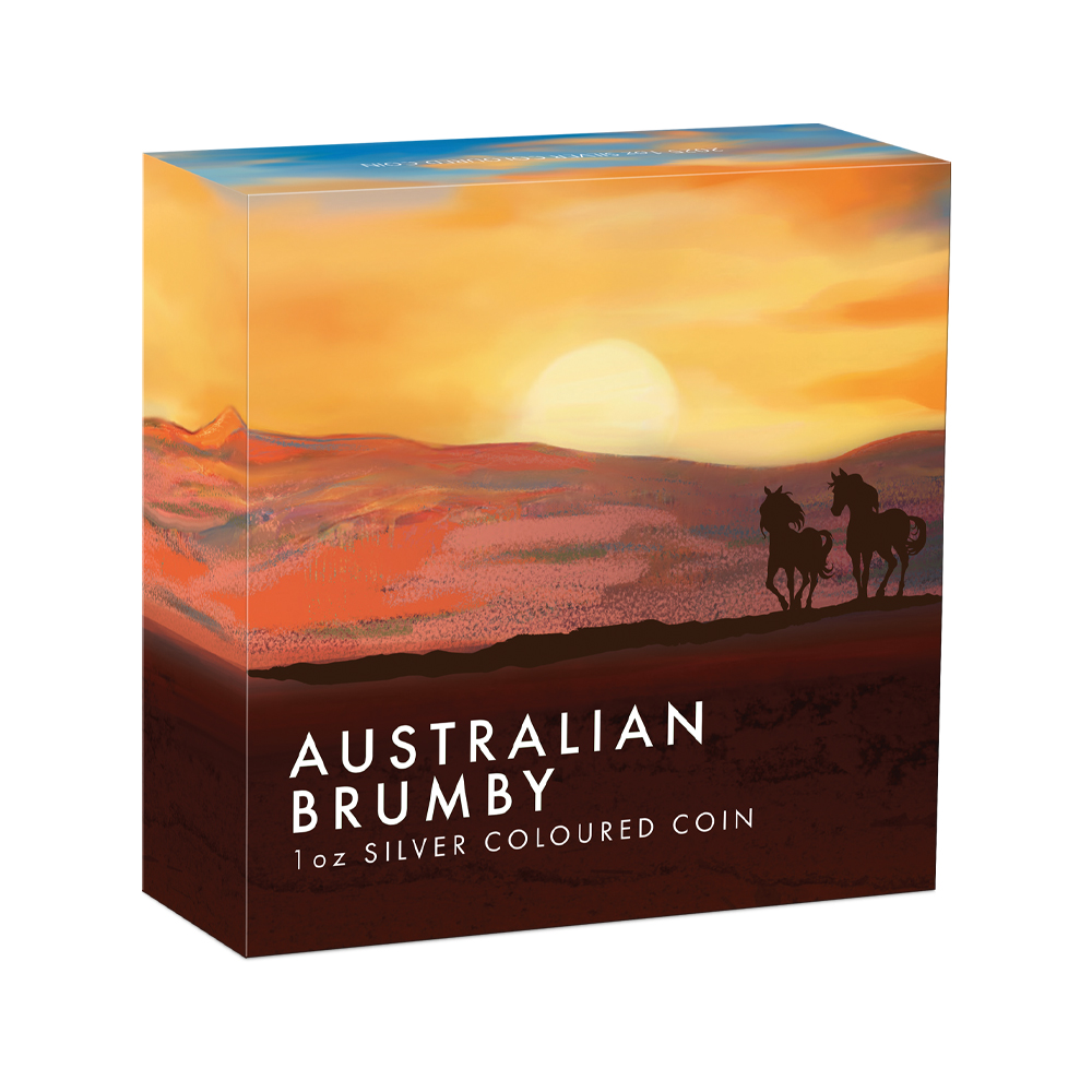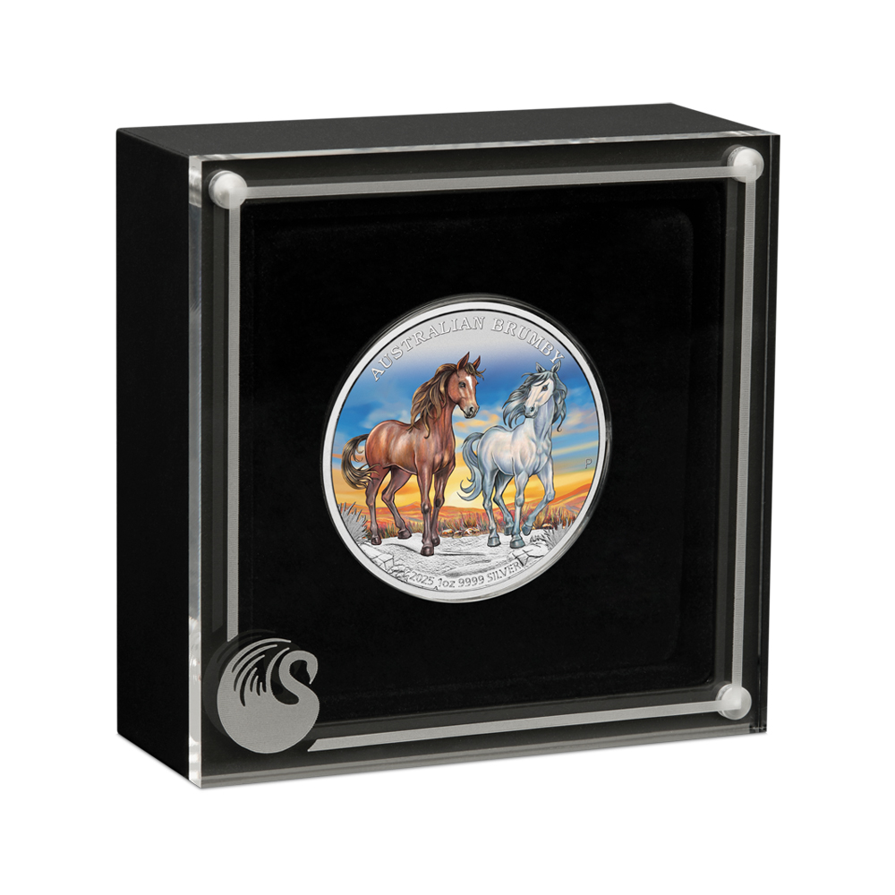 Each 2025 1 oz Colorized Australian Brumby Silver Coin comes in a black Perth Mint display case with a clear lid. The case is packaged in a Brumby-themed box and includes a numbered Certificate of Authenticity.