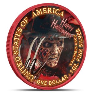 For the reverse of 2025 Colorized Halloween American Silver Eagle Claws of Fear Coins, the colorized artwork presents a figure inspired by Freddy Krueger. The design highlights a red-and-black striped shirt, a dark cap, and the character’s gloved hand with sharp claws to complete the theme.