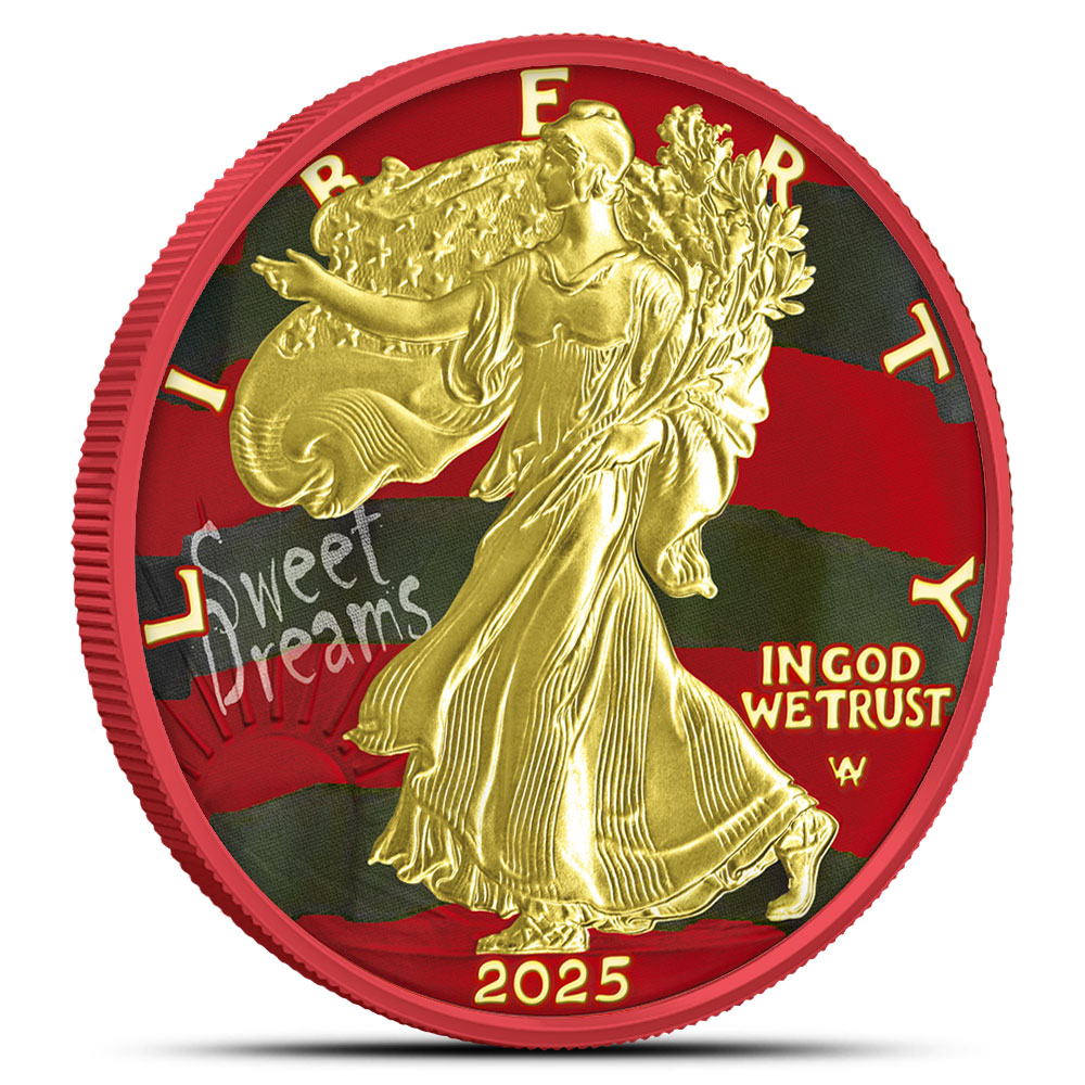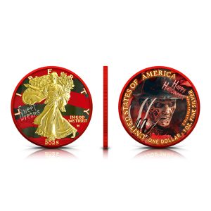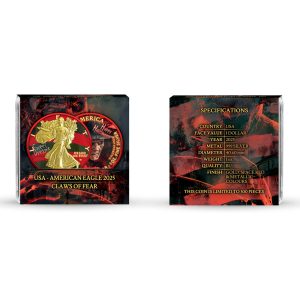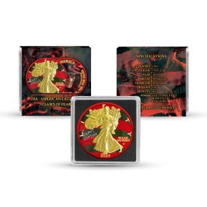 In the obverse design of 2025 1 oz Colorized Halloween Silver Eagle Claws of Fear Coins, you’ll see Adolph A. Weinman’s Walking Liberty presented with 24-karat gold plating on Liberty. Behind her, a striped background appears, echoing the well-known shirt associated with the nightmare figure that inspires this release.