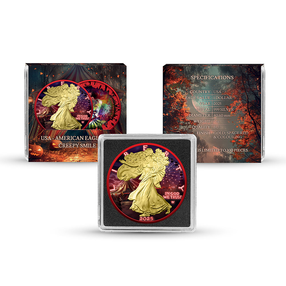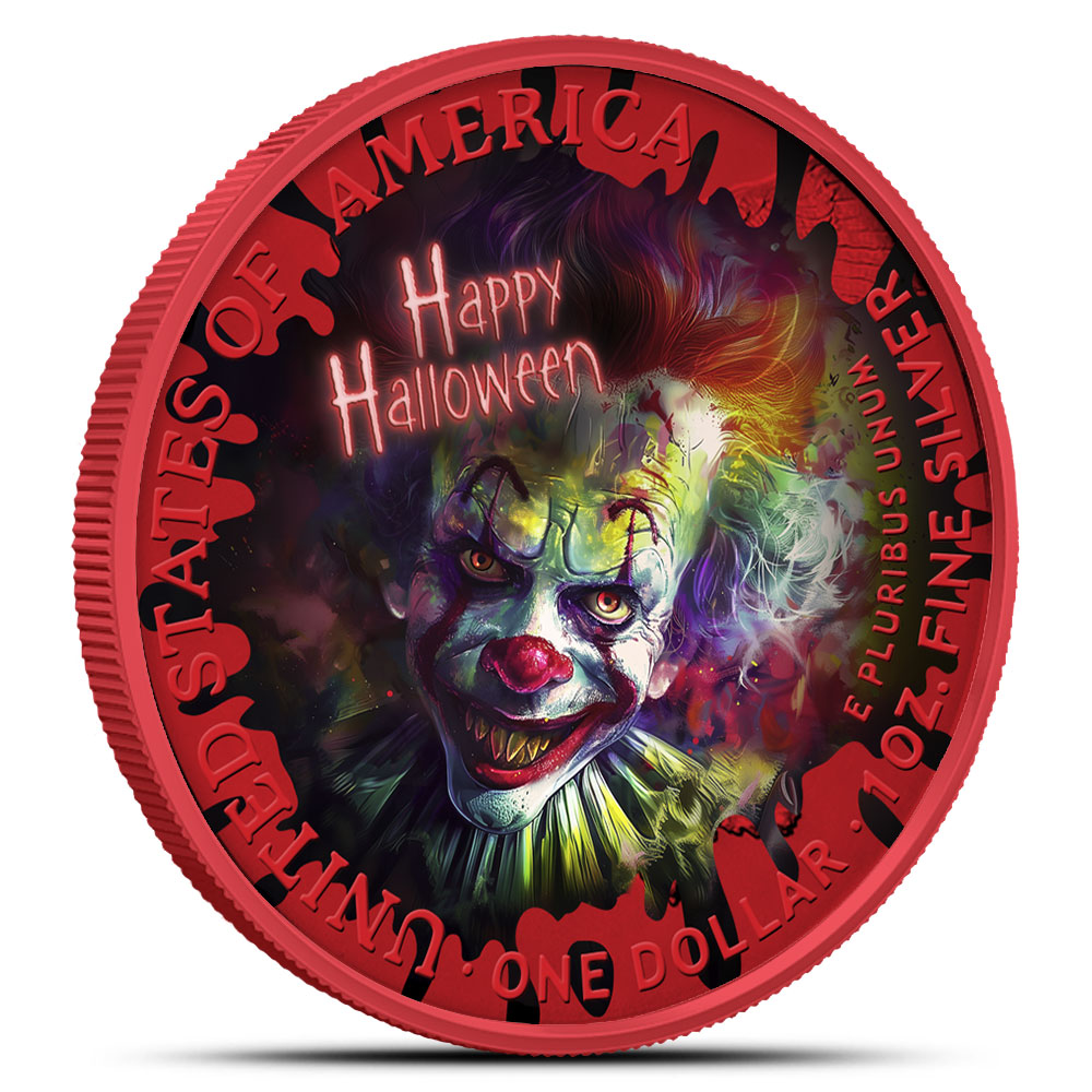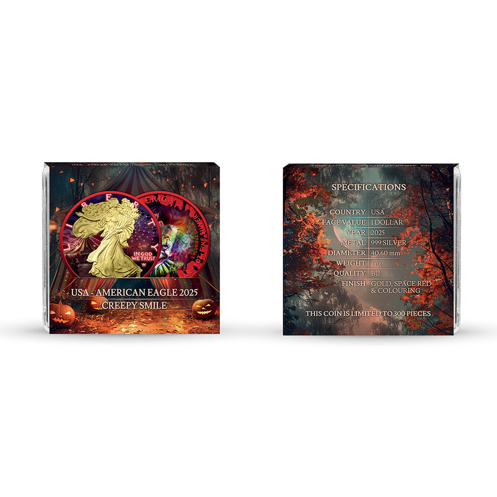 Each 2025 1 oz Colorized Halloween American Silver Eagle Creepy Smile Coin comes secured inside a Quadrum capsule. The capsule includes an outer sleeve that shows off the same clown design you’ll find on the coin, along with all the coin’s key details.