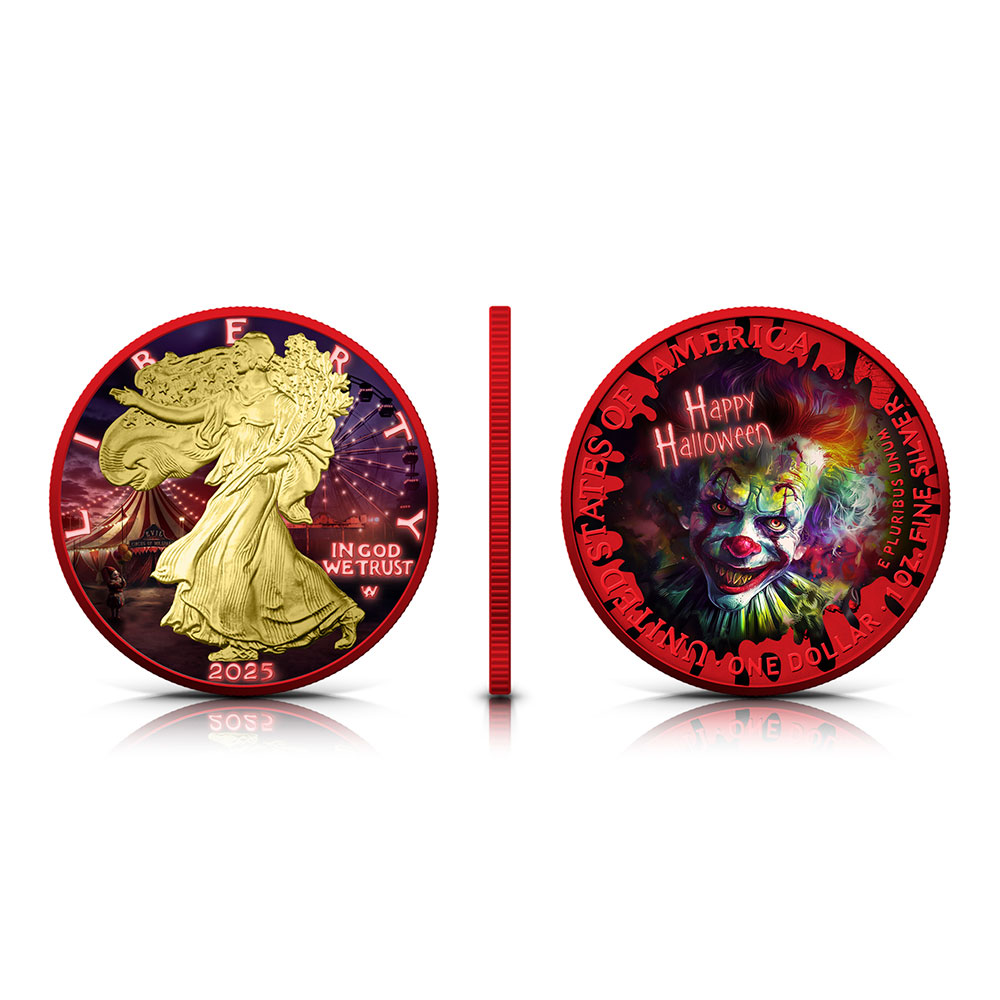 On the obverse of the 2025 Colorized Halloween American Silver Eagle Creepy Smile Coin, you’ll find Walking Liberty plated in 24-karat gold. The background features a colorful scene that resembles a haunted carnival, adding to the festive Halloween theme.
