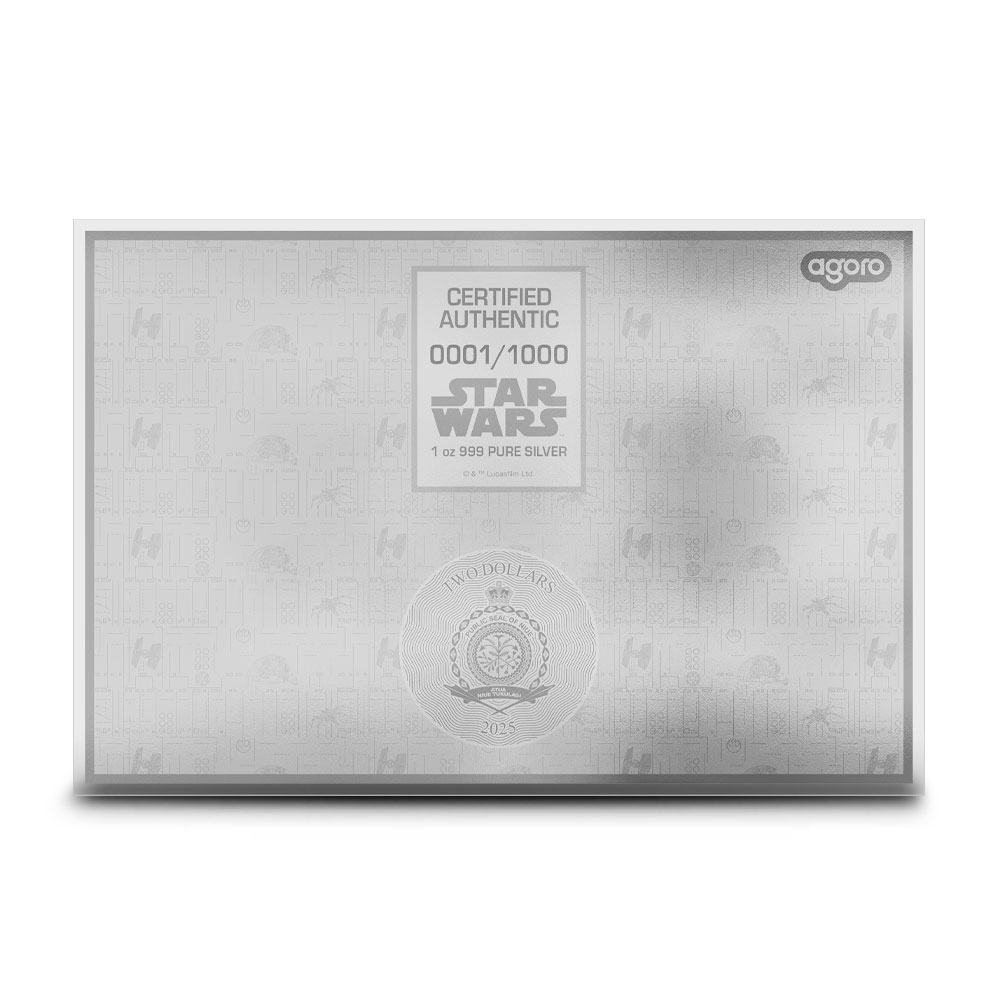 Each 2025 1 oz Colorized Niue Silver Star Wars Blueprint Series TIE Fighter Foil Coin is packaged in a display box with a Certificate of Authenticity. These silver foils carry legal tender status and feature blue color highlights on the reverse design.
