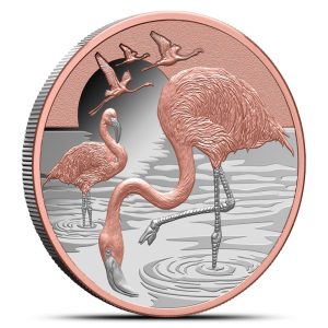 On the reverse of the 2025 1 oz Proof Silver Beauty and Grace Pink Flamingo Coin, five flamingos are shown. Two wade in the foreground, while three soar above the water. The birds are plated in rose gold, while the water and distant sun remain brilliant silver, creating contrast within the design.